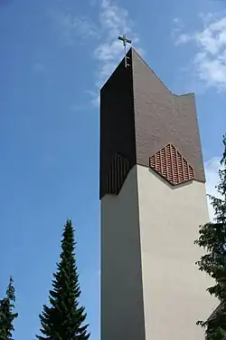 Der Kirchturm besass in seiner ursprünglichen Gestalt ein Pyramidendach, auf dessen Spitze sich ein schmiedeeisernes Kreuz befand. Beim Umbau der Kirche im Jahr 1977 wurde der Turm an das Äussere der erneuerten Kirche angepasst und durch eine Stahlkonstruktion erhöht, damit er zu den Proportionen der erweiterten Kirche passte. Das vierstimmige Geläute der Kirche wurde von der Giesserei F. Hamm in Salzburg gegossen, am 21. März 1926 von Bischof Georg Schmid von Grüneck geweiht und anschliessend in den Turm aufgezogen.[2][12]