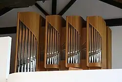 Die erste Orgel erhielt die Kirche zeitgleich mit den Glocken. Es handelte sich um ein Instrument, das von der alten katholischen Kirche in Dietikon stammte, die damals samt Orgel abgetragen wurde und dem Neubau der heutigen Kirche St. Agatha weichen musste. Die Orgelfirma Gebrüder Späth, Rapperswil, besorgte in Dietikon den Abbau der alten Orgel und überholte diese, bevor sie in die Kirche von Hinwil eingebaut wurde.[17] Nach dem Umbau der Kirche wurde die alte Orgel im neuen Kirchenraum erneut aufgestellt, aber sie erwies sich als altersschwach und sollte zunächst durch eine elektronische Orgel ersetzt werden. Dagegen bildete sich eine Opposition, sodass der Neubau einer Pfeifenorgel beschlossen wurde.[8] Die heutige, zweimanualige Orgel wurde von der Firma Orgelbau Kuhn AG in Männedorf gebaut und am 16. Juni 1985 eingeweiht.[7] Das Instrument verfügt über Schleifladen, mechanische Spiel- und Registertrakturen und 15 Register.[18]