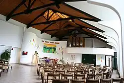 Die Kirche wies in den ersten Jahrzehnten nach ihrer Erbauung ein schlichtes Inneres aus, welches durch eine Holzdecke überspannt wurde. Es handelte sich um einen Längsbau, dessen Bänke auf den an den rechteckigen Kirchbau angegliederten Chor ausgerichtet war. Im Laufe der Zeit wurde das Innere der Kirche ergänzt und dem Geschmack der Zeit angepasst. Ein Ziel des Umbaus von 1978 war, das Kircheninnere den Vorgaben der Liturgiekonstitution des Zweiten Vatikanischen Konzils anzupassen. Eine wichtige Forderung des Konzils war die participatio actuosa, die tätige Teilnahme der Gläubigen am liturgischen Geschehen. In Zusammenarbeit mit dem Künstler Josef Caminada entschied sich Architekt Walter Bossart, diese Forderung durch eine Neuplatzierung des Altarraums zu ermöglichen. Die Gläubigen werden im Halbkreis um die neue Altarinsel gruppiert, wodurch sie sich auch räumlich näher am liturgischen Geschehen befinden. Nach Vorgaben von Architekt Walter Bossart und Künstler Josef Caminada schreinerte Primo Lorenzetti den Altar und den Ambo aus Redwood-Holz an. Die Symbolik des Altars wird bestimmt durch die runde Tischplatte – Symbol der Gemeinschaft der Gottesdienstgemeinde, aber auch Zeichen für die Ewigkeit – und durch die drei Füsse, auf denen die Tischplatte ruht. Die drei Füsse stehen für die Trinität und zeichnen in ihrer Anordnung ein Dreieck – ebenfalls ein Symbol für Gott.[13] Josef Caminada schreibt: „Der Altar als Tisch des Mahles bildet räumlich gesehen den Mittelpunkt eines grossen Zirkelschlages. Ein Drittel dieses Kreises befindet sich im Kirchenraum. Hier sind die Stühle der Gläubigen angeordnet. Der andere Teil des Kreises durchbricht die Mauern und soll die Gläubigen und Ungläubigen, die Lebenden und die Toten ausserhalb der Kirche in das Altargeschehen miteinbeziehen.“[14] Neben dem Altar befindet sich der Ambo, der als Ort der Verkündigung seine Ebenbürtigkeit mit dem Altar durch das gleiche Material erhält. Er besitzt die Grundform eines Pfeiles, der den Gläubigen die Richtung vorgeben will.[7] Hinter dem Altar befindet sich eine Chorwand, die dem Altarraum und dem liturgischen Geschehen seine Bedeutung verleihen. Der Chorbogen endet in der Mitte der hinteren Wand und geht über in zwei neue Wandelemente, die sich gegenseitig treffen und durchqueren. Josef Caminada schreibt dazu: „Hier bildet sich eine offene Pforte. Diese Pforte soll primär das Symbol des Hineingehens zu Gott darstellen, denn rechts haben wir den Tabernakel und links das Ewige Licht, das heisst: durch Christus finden wir den Eingang zu Gott.“[15] Der Tabernakel und das Vortragkreuz wurden von Josef Caminada aus den gleichen Materialien Schmiedeeisen und Feueremail gestaltet, wodurch ihre liturgische Verbundenheit ausgedrückt wird. Josef Caminada schreibt zum Tabernakel: „Ich habe aus einem würfelförmigen Schrein eine Rundung herausgenommen und so die Form eines Gefässes (Kelches) erhalten. Daraus treten zwei verschieden rote Kreisbogen hervor, darstellend den Wein, das Blut, die Wandlung. Und über diesen Bogen bildet sich ein winklig gebrochener weisser Halbkreis, gleichsam das Brot des Lebens - die Freude - die Auferstehung.“[7] Das Vortragekreuz wird aus verschiedenen Linien zusammengesetzt. Die von unten kommende Linie symbolisiert den Menschen, der von unten aus der Erde kommt. Er „steigt auf, entfaltet sich, alle Möglichkeiten scheinen ihm vorerst offen zu stehen. Aber allmählich wird ihm bewusst, dass der Weg nach oben zu Gott verbaut ist. Sein Weg führt, an einer für ihn unüberwindbaren Schwelle entlang, in die Waagrechte. Er bleibt erdgebunden, vergänglich, ohne Hoffnung. Christus geht für uns diesen Weg. Überwindet für uns die Schwelle des Kreuzes, den Tod, und eröffnet uns den Weg nach oben zu Gott, zum Leben.“[14] Der Taufstein befindet sich nach den Vorgaben des Zweiten Vatikanums nicht mehr in einer Taufkapelle beim Eingang zur Kirche, sondern vorne beim Altarraum. Er ist aus Mägenwiler Muschelkalk gehauen und stellt von der Seite betrachtet die Form eines Quells und eines Gefässes dar. Das Taufwasser befindet sich in einer kreuzförmig gearbeiteten Vertiefung, welche auf die Verbindung von Taufe und Kreuzestod Christi verweist.[16]