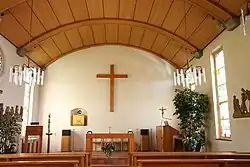 In der Kirche befindet sich der Besucher zunächst unter der Orgelempore, wo sich auch der Taufstein befindet. Diese Anordnung verweist auf die bis zum Zweiten Vatikanischen Konzil übliche Gestaltung eines Gotteshauses als Wegkirche, in der der Gläubige räumlich den inneren Weg zurücklegt, der durch die Taufe über die Teilnahme am Gottesdienst im Kirchenschiff bis zum Altarraum mit dem Allerheiligsten im Tabernakel gelangt. Der Altarraum hebt sich durch wenige Stufen vom restlichen Gottesdienstraum ab. Seit 1971 befindet sich im Altarraum ein schlichter Holzaltar, ein Ambo sowie an der Rückwand ein Holzkreuz sowie der Tabernakel, der von der vorherigen Innenausstattung übernommen wurde. Die getriebene Frontseite des Tabernakels zeigt neben dem Christusmonogramm die Worte „Der Meister ist da und ruft dich.“
