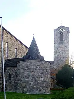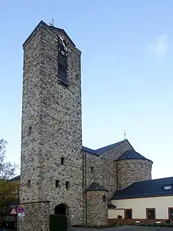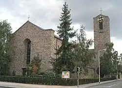 Die Kirche mit Platz für circa 300 Personen ist als dreischiffige Basilika klar gegliedert. Mit ihrer flachen Holzdecke erinnert sie an den Stil frühchristlicher Bauwerke. Das Mauerwerk besteht aus naturbelassenen Trachyt- und Muschelkalksteinen. Abweichend von der „heiligen Baulinie“ ist die Kirche in Nord-Süd-Achse errichtet worden. In der Ostwand befindet sich nur ein Fenster, durch welches Licht in den Altarraum fällt. Zusammen mit den sechs Fenstern in der Westwand zeigt es die sieben Sakramente. In der Nordwand über dem Haupteingang zeigt ein großes Fenster eine Darstellung des Erzengels Michael. Es wurde 1952 von Annelise Reichmann geschaffen.