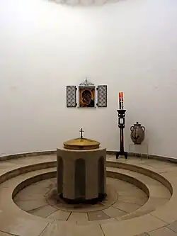 Eine weitere Kapelle rechts vom Eingang, vorbei an der Seitenkapelle des heiligen Apostels Judas Thaddäus, ist ein runder Seitenanbau. In der Mitte befindet sich das Taufbecken, das um zwei Stufen tiefer gesetzt ist, um das Hinabsteigen ins Wasser anzudeuten. Wiedergeboren aus dem Wasser und dem heiligen Geist steigt der Täufling nach der Taufe wieder herauf. Ein kleines Spitzbogenfenster mit zwei Fischen rechts und links vom Kreuz erhellt den Gang zur Taufkapelle und erinnert an das Erkennungszeichen der Urchristen.