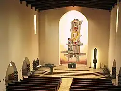 Das Mobiliar des Altarraums (Altar, Tabernakelsäule, Ambo, Sedilien, Kredenz und Podest der Marienstatue) wurde aus Anröchter Dolomit gehauen. Der Altar beherbergt Reliquien des Heiligen Petrus Canisius. Die Apsis und der Chorraum werden von einem Großmosaik dominiert, das die um das Mittelschiff herumlaufenden 14 Kreuzwegstationen um eine zusätzliche fünfzehnte ergänzt. Es zeigt den auferstandenen Christus. Während der Renovierung der Kirche 2013 wurde die zuvor weiß angestrichene Apsis durch den Kirchenmaler Jörg Held farblich neu gestaltet.
