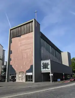 Die Besonderheit des Ortes liegt auch in der Wirkung des Gebäudes und seiner künstlerischen Ausstattung. Kunst und Architektur des doppelgeschossigen Kirchbaus aus Stahlbeton gelten als herausragendes Beispiel der Nachkriegsmoderne. Die Bauteile des Gebäudes sind in verschieden großen Rechtkantformen ausgebildet – also der Hauptbaukörper mit Hochschiff und Seitenschiffen, der hohe Altarraum und der Fassadenturm mit Haupteingängen und Glockengeschoss.[10] Es wurden unterschiedliche Baumaterialien verwendet: Beton, Naturstein, Holz, Glas/Dickglas und Kunststoff. Im Foyer, Treppenaufgang und Altarraum beeindrucken große Flächen aus Sichtbeton.[11] Durchscheinende Faltwerkwände aus glasfaserverstärktem Plexiglas – einzigartig in Konstruktion und Größe – tauchen die Halle je nach Tageszeit und Wetterlage in unterschiedliches Licht.[12]