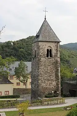 Der Turm im Stil der Romanik ist ein Bruchsteinbau mit fünf Geschossen und Zeltdach. Die unteren Geschosse haben in Tuffstein gefasste schmale Schlitzfenster. Im Glockengeschoss sind es gekoppelte Rundbogenfenster in spitzbogigen Blenden. Die ehemalige Turmhalle im unteren Geschoss ist seit 1954 Friedhofskapelle beziehungsweise Aussegnungshalle. Im ersten Obergeschoss wurde zur gleichen Zeit eine über eine Außentreppe zugängliche Gedenkstätte für die Toten des Krieges eingerichtet. In einer Nische an der Nordwand steht eine 1932 von dem in Koblenz-Moselweiß ansässigen Bildhauer Henri Helwegen nach einem alten Vorbild geschaffene 80 Zentimeter hohe Pietà.[1]