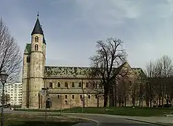 Die Errichtung der heutigen romanische Kreuzbasilika begann unter Erzbischof Werner von Steußlingen (1063–1078), der schon in der Kirche beigesetzt wurde. Unter Erzbischof Norbert von Xanten (1126–1134), der 1120 den Prämonstratenserorden gegründet hatte, wurde das Westwerk fertiggestellt. Es besteht aus einem niedrigen quadratischen Mittelturm mit Satteldach in Richtung der Kirchachse, flankiert von zwei etwas höheren Rundtürmen in den Winkeln zwischen diesem und den Seitenschiffen.