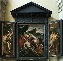 Ein gemaltes Triptychon mit der Schöpfung wurde von J. Snellinck 1609 als Altarbild des Hauptaltars angefertigt und steht heute in der Südkapelle Unserer Lieben Frau von der Scapula; weiterhin die Gemälde Taufe des heiligen Augustinus durch den heiligen Ambrosius von Mailand von 1653 und Auffindung des Kreuzes durch die heilige Helena von Simon De Pape, 1672, ursprünglich im Büßerkloster. Zu den weiteren Gemälde gehören eine frühe Kopie der Madonna mit dem Fisch von Raffael aus dem 16. Jahrhundert; Der heilige Ignatius von Loyola, nach Rubens, und Der heilige Stanislaus Kostka, beide aus dem 17. Jahrhundert und aus dem Jesuitenkloster; sowie Der heilige Simon Stock empfängt das Skapulier der Muttergottes vom Karmel, eine Grisaille aus dem 17. Jahrhundert.