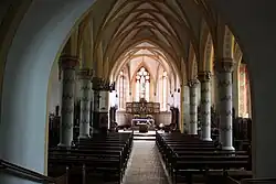 Das Querschiff ist im Inneren als Vorraum gestaltet und befindet sich 5 Stufen über dem Niveau der Langschiffe. Es nimmt außerdem in voller Breite die Empore auf. Im Inneren der Kirche befinden sich etwa 140 Sitzplätze und 4 Beichtstühle.