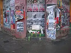 Kerzen, Blumen, Kreuze erinnern an das Hausprojekt und seine Räumung