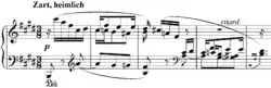 Dieses ekstatische Ende wird im letzten Lied Frühlingsnacht erreicht, in dem die Musik von Anfang an eine freudig erregte Stimmung erzeugt: Die Harmonien bilden eine mitreißende Kette aus Septakkorden, hoch liegende Akkorde pulsieren in Sechzehntel-Triolen, die immer nur am Ende jeder der drei Strophen zum Stillstand kommen. Während der zweiten Strophe wird ein neues sich aufwärts schwingendes Motiv eingeführt, das am Schluss des Liedes, bei den Worten „Sie ist deine, sie ist dein!“ zur Septime erweitert wird (Notenbeispiel links). Wo also am Ende des ersten Teils die aufsteigende Quinte zur Sext vergrößert wurde, kulminiert der Zyklus nun in der noch weiter ausholenden Septim. Im Klaviernachspiel aber dominiert wieder die Quinte, was den motivischen Kreis des Gesamtwerks wieder schließt.
