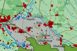 Zur Liemers zählen die Orte Aerdt, Azewijn, Babberich, Beek, Braamt, Didam, Duiven, Etten, Gendringen, Giesbeek, Groessen, ’s-Heerenberg, Herwen, Kilder, Lengel, Loerbeek, Lobith, Loo, Megchelen, Netterden, Pannerden, Spijk, Stokkum, Tolkamer, Ulft, Varsselder, Wehl, Westervoort, Wijnbergen, Zeddam und Zevenaar.