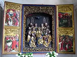 Wichtigstes Kulturdenkmal der Kirche ist ein kleiner gotischer Flügelaltar aus der Zeit um 1500, der Siebenhirter- oder Apostelaltar im südlichen Seitenschiff. Er ist nach dem Millstätter Hochmeister des Georg-Ritter-Ordens Johann Siebenhirter († 1508), vermutlich dem Stifter, benannt. Sowohl das Wappen des Georgsritterordens als auch jenes von Siebenhirter ist zu erkennen. Das Zentrum des Altars ist ein Schnitzrelief mit der Herabkunft des Hl. Geistes, wobei Maria im Kreise der zwölf Apostel sitzt. Die vier Flügelbilder stellen links oben den Marientod darunter den ungläubigen Thomas, rechts oben den zweifelnden Petrus beim Gang über das Wasser (Fischzug) sowie die Aussendung der Apostel dar. Die Gemälde werden einem unbekannten „Meister von Lieseregg“ zugeschrieben, der sich auch in Villach nachweisen lässt. Da die Ausführung des Bodens jener des Altars in Großgmain sehr ähnlich ist, könnte es ein Maler aus Salzburg gewesen sein.[5] Die Außenflügel enthalten Bilder der Apostel Petrus und Paulus, darunter die Evangelisten Lukas und Johannes. Es gibt einen dreieckigen Aufsatz mit geschnitztem Rankenwerk, wobei der ursprünglich Aufsatz und Predella fehlen. Einmalig in Kärnten ist die groteske Darstellung der Figuren. Während die Gesichter einheitlich, eher schmal in gleicher Größe dargestellt sind, entsprechen die körperlichen Proportionen und die Haltung nicht der natürlichen Anatomie.
