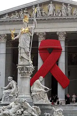 2010 bildete der Life Ball am 17. Juli den Auftakt zur XVIII. Internationalen AIDS-Konferenz, mit 19.300 Delegierten aus 139 Ländern.[10] Daher standen in dieser Nacht neben dem Rathaus und Rathausplatz auch das gegenüber liegende Burgtheater und das Parlamentsgebäude ganz im Zeichen des Red Ribbon. Das „Konzept der drei Häuser“ vereinte an diesem Abend drei außergewöhnliche Veranstaltungen und wichtige Organisationen: die amfAR-Gala im Parlament, die Elton John AIDS Foundation beim Red Ribbon Cotillion im Burgtheater sowie die William J. Clinton Foundation beim traditionellen Life Ball im Rathaus.[11]