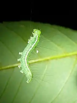 Die erwachsene Raupe verjüngt sich sowohl zum vorderen als auch zum hinteren Ende hin etwas. Sie ist grün gefärbt mit relativ wenigen, langen, senkrecht abstehenden Borsten. Die Borsten im Kopfbereich zeigen nach vorne. Jüngere Stadien sind relativ stärker behaart und zeigen meist vier schwarze Punkte auf dem Rücken sowie je einen weiteren schwarzen Punkt auf der Seite pro Segment. Der Kopf ist bei der adulten Raupe grünlich, jüngere Stadien haben zwei gelängte schwarze Punkte auf der Kopfoberseite. Die Rückenlinie ist relativ fein und weißlich. Dagegen sind die Nebenrückenlinien deutlich breiter und leicht gelblich gehalten. Die Stigmen sind schwarz gefärbt.