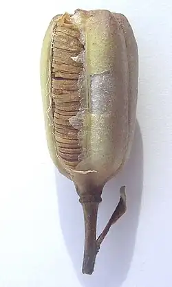 Die Samen sind flach, annähernd rund[5] in 60°-Winkeln[1] und sind schmal geflügelt.[2] Sie sind an der Oberfläche warzig hellbraun und in ihrer Mitte zeichnet sich der dunkle Embryo ab.[1]