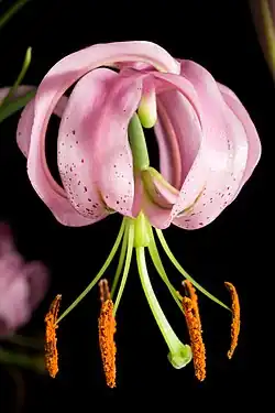 Die Pflanze blüht im Juli mit 1 bis 6 in einer Rispe nickender, stark duftender Blüten. Die zwittrigen Blüten sind dreizählig. Die sechs gleichgestalteten Blütenhüllblätter (Tepalen) sind stark zurückgebogen (Türkenbundform), 35 bis 45 mm lang und 8 bis 10 mm breit. Die Grundfarbe der Blüten ist blass purpurn, rosa-lila oder hellviolett mit tief purpurnen Punkten in Richtung Basis. Die Nektarien sind dicht und auf beiden Flächen papillös. Jede Blüte enthält drei Fruchtblätter und sechs Staubblätter. Die Antheren sind dunkel purpurn und etwa 14 mm lang, die Pollen sind ziegelrot und die Filamente sind etwa 20 mm lang. Der Fruchtknoten ist zylindrisch zwischen 8 und 10 mm lang bei einem Durchmesser von 2 mm. Die Samen reifen in runden 12 bis 20 mm großen Samenkapseln heran. Der Samen von Lilium cernuum keimt sofortig-epigäisch.