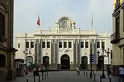 Nach dem Unabhängigkeitskrieg wurde Lima zur Hauptstadt der Republik Peru, aber die wirtschaftliche Stagnation und die politischen Unruhen im Land lähmten die städtische Entwicklung. Diese Situation änderte sich in den 1850er Jahren, als steigende öffentliche und private Einnahmen aus dem Guano-Export ein rasches Wachstum der Stadt ermöglichten[53]. In den folgenden zwanzig Jahren finanzierte der Staat den Bau großer öffentlicher Gebäude, die die alten vizeköniglichen Einrichtungen ersetzen sollten, darunter der zentrale Markt, der allgemeine Schlachthof, die Nervenheilanstalt, das Zuchthaus und das Krankenhaus Dos de Mayo. Auch die Verkehrsverbindungen wurden verbessert: 1850 wurde eine Eisenbahnlinie zwischen Lima und Callao fertiggestellt[54], und 1870 wurde eine Eisenbrücke über den Fluss Rímac eingeweiht, die Puente Balta. 1872 wurden die Stadtmauern Limas von dem amerikanischen Ingenieur Henry Meiggs im Auftrag der peruanischen Regierung[55] in Erwartung eines weiteren städtischen Wachstums abgerissen. Diese Zeit der wirtschaftlichen Expansion vergrößerte jedoch auch die Kluft zwischen Arm und Reich und führte zu weit verbreiteten sozialen Unruhen.
