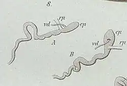 Im Genitalapparat erreicht der Penis etwa die Hälfte der Körperlänge. Der Penisretraktormuskel inseriert etwa auf zwei Drittel der Penislänge (von der Basis gerechnet). Der Samenleiter mündet seitlich nahe dem apikalen Ende in den Penis. Der Apex bildet somit ein blindes Ende. Im Verdauungstrakt ist kein Blinddarm ausgebildet.