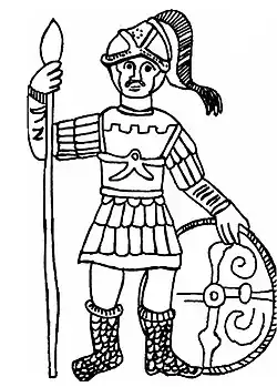 Nach Auswertung neuer Forschungsergebnisse existierte der Rheinlimes auf dem Gebiet der Provinz Germania II mit ziemlicher Sicherheit noch weit über die Katastrophe des Jahres 407 hinaus.[41] Der – wohl nur vorübergehende Abzug – der Grenztruppen unter Stilicho, 401/402, änderte zunächst nur wenig. Die verbliebenen römischen Truppen wurden dabei zunächst durch föderierte Burgunden, ab etwa 435 dann zunehmend durch fränkische Söldner verstärkt. Viele Kastelle blieben so auch weiterhin bemannt. Um 420 kontrollierten sie gemeinsam mit regulären Einheiten noch einmal den Rhein in seiner gesamten Länge. Um 450 beschleunigte sich dann aber zunehmend der Zerfall der römischen Herrschaft nördlich der Alpen, 459 wurde Köln durch die Franken besetzt. Spätestens mit der Niederlage des „Rex Romanorum“ Syagrius gegen die Franken 486/87 endete die römische Kontrolle über Gallien. Die Verbände der Rheinarmee dürften sich danach geschlossen in den Dienst des Frankenkönigs Chlodwig gestellt haben.[42] Die nebenstehende Abbildung stammt von einer alamannischen Silberplatte des 7. Jahrhunderts. Die betont klassische Form der Darstellung ist möglicherweise nur ein künstlerisches Zugeständnis, aber sie könnte einen jener, durch die germanische Landnahme abgeschnittenen, gallorömischen Soldaten zeigen, denen es gelang, ihre Kultur und Traditionen bis ins 6. Jahrhundert zu bewahren. Auch viele der Limeskastelle überdauerten das Ende des Weströmischen Kaisertums wohl noch um mehrere Jahrzehnte, was durch die archäologische Auswertung von Kastellfriedhöfen sowie Münzfunde, besonders von solidi,[43] belegt ist. Die Garnisonen am Limes verschwanden daher sicher nicht von einem Tage auf den anderen, sie wurden aber mit der Zeit personell immer schwächer und gingen schließlich in Bürgermilizen auf, deren Loyalität nur mehr ihren unmittelbaren Befehlshaber oder örtlichen Königen galt.[44]