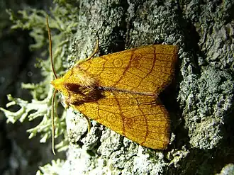 Die Vorderflügel von Tiliacea citrago sind gelb bis ziegelrot. Zwei dunklere Querbinden unterscheiden die Art deutlich von den verwandten Arten.