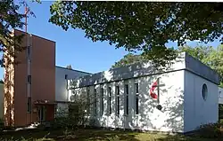 Das Gemeindezentrum besteht aus einem Gebäudekomplex, dessen flachgedeckte Baukörper unterschiedliche Geschosse haben. Es beherbergt neben der Saalkirche die Räume für den Pfarrer und das Gemeindebüro, ferner einen Gemeindesaal. Der höchste Baukörper ist der Treppenturm, auf dessen Dach ein Kreuz steht. Der Kirchsaal hat an den Längswänden schmale hohe Fenster. Die Altarwand ziert ein Rundfenster. Hinter dem Kirchsaal befindet sich, durch eine Glaswand getrennt, ein Raum, in den der Gottesdienst per Lautsprecher übertragen wird. Hier können Eltern dem Gottesdienst folgen, ohne dass die Kinder ihn stören.