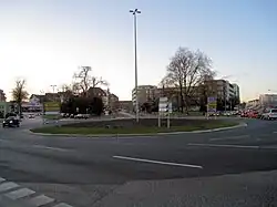 - Foto des Lindenplatzes in den 1950er Jahren; das Bodenmosaik des Danziger Wappens ist trotz der Rückbenennung noch vorhanden