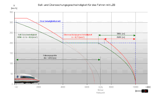Die Sollgeschwindigkeit berücksichtigt dabei bereits eine ggf. notwendige Bremsung bei Annäherung an den Zielpunkt, sie fällt also bei Annäherung kontinuierlich ab, bis sie schließlich am Zielpunkt mit der Zielgeschwindigkeit identisch ist. Ein Halt zeigendes Signal ist dabei ein Zielpunkt mit der Zielgeschwindigkeit null.