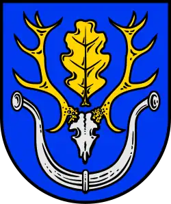 Blasonierung: „In Blau ein goldenes Zwölfender-Hirschgeweih mit silbernem Schädel, zwischen den Geweihstangen ein aufgerichtetes Eichenblatt, unter dem Geweih zwei offene silberne Büffelhörner.“