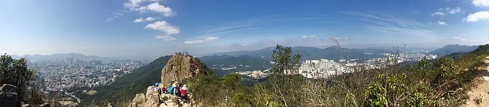 - ↑ Gipfelpanorama – Lion Rock Hill (獅子山–山頂全景圖 / 狮子山–山顶全景图, Shīzishān – shāndǐng quánjǐngtú, Jyutping Si1zi2saan – San1deng2 cyun4ging2tou4), Blickrichtung Süden – in der Ferne der Victoria Harbour und die Insel Hongkong.