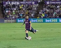 In der Saison 2018/19 wurde Messi neuer Mannschaftskapitän als Nachfolger von Andrés Iniesta.[46] Messi gewann seine 33. Trophäe mit dem FC Barcelona am 12. August 2018 bei der Supercopa de España 2018 gegen den FC Sevilla mit 2:1 und erreichte damit als Rekordspieler (18 Spiele) sowie Rekordtorschütze (13 Treffer) mit acht Titeln auch die meisten Erfolge in diesem Wettbewerb.[47][48] Am 18. August 2018 schoss er beim 3:0-Sieg gegen Deportivo Alavés das 6000. Erstligator des FC Barcelona. Am 13. Januar 2019 verbesserte Messi beim 3:0 gegen SD Eibar seinen Torrekord in der spanischen Liga mit dem 400. Tor in 435 Spielen, womit er durchschnittlich fast ein Tor pro Spiel (Torquote 0,92) seit seinem Debüt erzielte.[49] Im Rückspiel der Copa del Rey 2018/19 gegen den FC Sevilla schoss Messi seinen 50. Treffer in 70 Spielen in diesem Wettbewerb. Am 22. Februar 2019 erzielte er zwei Treffer beim 2:2 gegen den FC Valencia und sicherte damit dem FC Barcelona nicht nur einen Punkt, sondern erreichte so mit 21 Ligatoren in 20 Spielen auch in seiner elften Spielzeit in der Liga in Serie mindestens 20 Tore, was vor ihm bisher noch kein Spieler in einer der fünf europäischen Top-Ligen schaffte.[50][51][52] Am 23. Februar 2019 drehte Messi beim 4:2 gegen den FC Sevilla das Spiel und erzielte seinen dritten Hattrick in der Saison (Champions League, LaLiga), den 33. Hattrick in der Liga,[53] den 44. mit Barcelona und den 36. Treffer in 37 Spielen gegen den FC Sevilla.[54] Er erreichte damit auch das 50. Spiel in seiner Karriere mit drei oder mehr Toren (sechs davon mit der Nationalmannschaft Argentiniens).[54] Am 31. März 2019 schoss Messi beim 2:0 (0:0) im katalanischen Derby gegen Espanyol Barcelona seine Treffer 30 und 31 in der spanischen Liga und erzielte zusammen mit den Toren in der Champions League (8) sowie dem spanischen Pokal (2) damit in den vergangenen zehn Jahren in jeder Saison mehr als 40 Pflichtspieltore.[55][56] Er traf am 6. April 2019 zum 2:0 im Spiel gegen den Tabellenzweiten Atletico Madrid und sicherte sich den Rekord des Spielers mit den meisten Siegen (335) in LaLiga.[57][55][56]