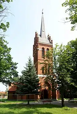 Wenige Jahre nach der katholischen Kirche wurde in Lipowitz 1905/06 auch eine evangelische Kirche errichtet. Sie war eine der ostpreußischen Jubiläumskirchen, die anlässlich des 200-jährigen Bestehens des Königreichs Preußen erbaut und am 5. Oktober 1906 eingeweiht wurde.[10] Es handelte sich um einen massiven Bau auf Feldsteinfundament mit Chorturm. Die Kirche hatte im Inneren ein geschnitztes Holzkreuz aus Tirol. Die Orgel war ein Werk des Orgelbaumeisters Bruno Goebel in Königsberg (Preußen). Im Winter 1945 wurde das Gotteshaus von sowjetischen Soldaten niedergebrannt. Die Überreste wurden 1957 bis auf die Grundmauern abgerissen.