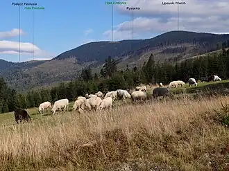 Die Hänge sind bewachsenen. Auf der Alm Hala Lipowska befindet sich eine Berghütte.