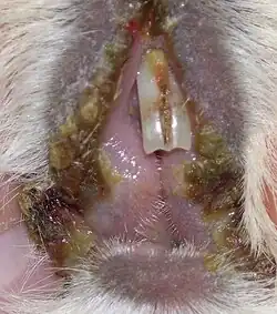 Die Ursache der Erkrankung (Ätiologie) ist bislang nicht vollständig geklärt. Diskutiert werden eine Minderung der Abwehrfunktion der Haut infolge eines Mangels an Vitamin A, Vitamin C und B-Vitaminen, essentiellen Fett- und Aminosäuren, Spurenelementen (Magnesium, Mangan, Zink, Cobalt), kleinste Verletzungen (Mikroläsionen) im Maulbereich durch Einstreu und harte Futterteile sowie deren Besiedlung durch Keime (Bakterien wie Staphylokokken und Pilze wie Candida albicans), auch solcher mit denen das Tier durch die Aufnahme von Blinddarmkot (Caecotrophie) physiologisch in ständigem Kontakt ist.