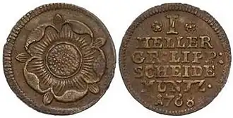 In Lemgo war die Münzstätte der Edelherren zur Lippe vom ersten Jahrzehnt des 13.[4] bis Mitte des 14. Jahrhunderts. Dazu gehörte die wichtige, sogenannte Wessele (= Wechselbank). Zunächst wurden Pfennige auf Soester und Paderborner (Brakeler) Schlag, dann nach englischem Vorbild (Sterlinge) geprägt. Weiter entstanden unter Bernhard VII. (1431 bis 1511) in Lemgo Stüber und kleinere Werte mit dem lippischen Wappen. Auch die Ausmünzung 1528 unter Simon V. erfolgte wohl in Lemgo (ältester lippischer Taler mit Bildnis und Wappen des Grafen; Hohlpfennige). Schließlich wurde hier von 1812 bis 1825 das lippische Kupfergeld hergestellt.