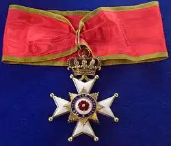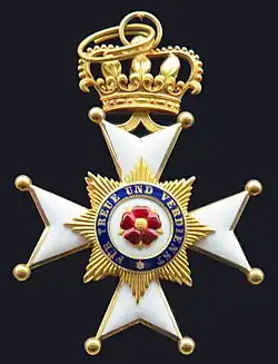- Ehrenkreuz I. Klasse nur für den Vorstand einer höheren Behörde. Das Tragen mit Cordon bleibt den Fürsten vorbehalten.