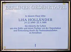 1971 wurde Lisa Holländer als Gerechte unter den Völkern ausgezeichnet.[1] Sie starb 1986. Im November 2005 wurde am Gebäude Sächsische Straße 26 eine Gedenktafel für Lisa Holländer enthüllt.[2]