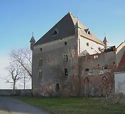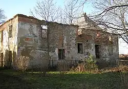 - Das Schloss Fuchswinkel (Dwór Lisie Kąty) ist eine rechteckige Anlage mit einem quadratischen Eckturm und hohem Pyramidendach. Der Bau entstand um 1600 im Stil der Renaissance und wurde Ende des 19. Jahrhunderts im Neugotik|neugotischen Stil umgebaut. Das zweigeschossige Gebäude besaß ursprünglich ein Satteldach. Heute stehen neben dem Eckturm nur noch die Außenmauern.[10] Das Gebäude wurde 1964 unter Denkmalschutz gestellt.[11]