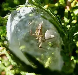 Die erste Eiablage erfolgt zwischen dem 13. und dem 91. Tag nach der Adulthäutung. Die befruchteten Eier messen fast ein Millimeter Durchmesser und sind hell, kugelrund und weich. Nicht entwickelte Eier sind dunkelbraun, eingeschrumpft und hart. Zwei bis drei Tage vor dem Schlüpfen der Jungtiere gegen Ende der Nacht wird zwischen Pflanzenstängeln ein Glockengewebe gewebt. Dieses unten offene, meist fünf Zentimeter hohe, drei Zentimeter weite, am Dach am dichtesten gesponnene Gespinst wird in höchstens ein Meter Höhe befestigt. Während des Spinnens heftet das Weibchen den Eikokon an eine Unterlage und nimmt ihn von Zeit zu Zeit in die Cheliceren. Zum Schluss wird der Kokon im Glockengewebe aufgehängt. Die geschlüpften Jungen werden von der Mutter bewacht und vor allem vor anderen Spinnen verteidigt.