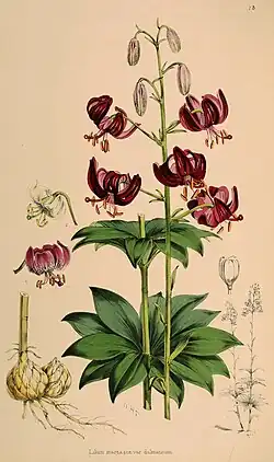 In der Illustration botanischer Gartenmagazine übernahm ab 1834 Walter Hood Fitch von William Jackson Hooker als dessen Nachfolger eingesetzt, den Posten als Chefillustrator des Curtis’s Botanical Magazines sowie aller Veröffentlichungen des Royal Botanic Gardens (Kew). Fitch blieb bis 1877 43 Jahre Chef-Lithograph und fertigte in dieser Zeit mehrere tausende Abbildungen, die ihn zum bedeutendsten und bei weitem produktivsten Pflanzenillustrator nicht nur der Viktorianischen Ära, sondern allgemein werden ließen.[26][27] Fitch wurde über die lange Periode nicht nur vom späteren Direktor des Royal Botanic Garden, Kew, Joseph Hooker für die Illustrationen beschäftigt, er wurde darin fast ausgebeutet, da er über 9.900 Illustrationen anfertigte, jedoch dafür nur wenig Geld bekam, was 1877 zum Bruch führte.[28] Fitch stattete auch die aufwendige Lilien-Monographie von Henry John Elwes mit Abbildungen aus, unter anderen die Tafel mit Lilium dalmaticum.
