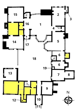 1: Große Halle, 2: Empfangszimmer, 3: Aborterker, 4: Treppe, 5: Gesellschaftszimmer, 6: Ausstellungsraum, 7: Kapelle, 8: Altarraum, 9: Kornspeicher, 10: Torhaus, 11: Brücke, 12: Aborterker, 13: Brauerei (heute öffentliche Toiletten), 14: Shop, 15: Restaurant, 16: Screens passage, 17: Vorbau, 18: Hof, 19: Hundehütte. Farbige Bereiche sind nicht öffentlich zugängig.
