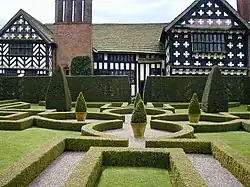 Das unregelmäßige Gebäude umstellt in drei Flügeln einen kleinen gepflasterten Hof. Die hundertjährige Baugeschichte fand während der englischen Renaissance statt, doch ist das Bauwerk in seiner Anlage mittelalterlich und enthält lediglich schmückende Elemente der Renaissance wie die Verzierung des Torhauses[3] und elisabethanische Kamine. Es ist überwiegend ein Fachwerkbau, mit Ausnahme der gemauerten Kamine.[4] Die Bauweise ist, wie üblich bei Gebäuden dieser Epoche in Cheshire, ein Fachwerk aus Eichenbalken auf einem Steinfundament. Diagonale schwarze Eichenbalken schmücken die Fassaden in Chevron- und Rautenmustern. Weiter oben wiederholt sich in Fassaden und Erkern ein Kleeblattmotiv.