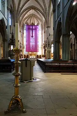 Ein violettes Fastentuch verhüllt das Kreuz in der römisch-katholischen St.-Ludgerus-Kirche in Billerbeck