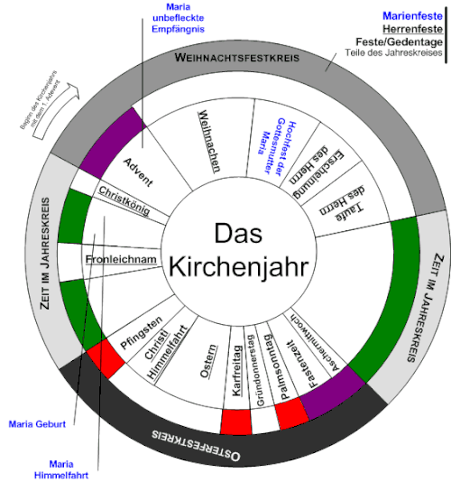Die Feste im Jahreskreis mit den zugeordneten liturgischen Farben in der katholischen Kirche