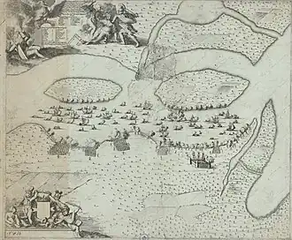 Befestigungen, Truppenbewegungen, Batterien der Schlacht bei Narva gezeichnet von Zacharias Wolf.