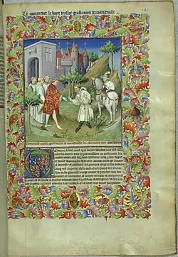 Später, 1413, schenkte Johann Ohnefurcht das Manuskript seinem Onkel Jean Duc du Berry, dessen Wappen auf den Folios 1, 97, 136v, 226 und 268 erscheint. Inventare aus den Jahren 1413 und 1416 aus der persönlichen Bibliothek des Herzogs von Berry bestätigen, dass das Manuskript bis zu seinem Tod in seinem Besitz blieb.
