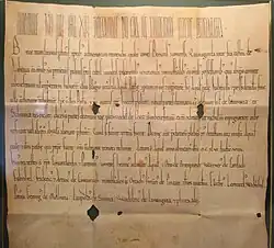 Im Ostfränkischen und später Heiligen Römischen Reich gehörte das Gebiet um Ljubljana zur Mark Krain. Der Zeitraum zwischen 1112 und 1125 ist die Entstehungszeit der ersten schriftlichen Aufzeichnungen von Laibach. Die erste urkundliche Erwähnung der Stadt stammt aus dem Jahr 1144.[8] Die von den Spanheimern gegründete Siedlung wurde um 1220 erstmals Stadt genannt, 1243 sind ihr Marktrecht und ihre Stadtmauer aktenkundig, 1280 wurden die Einwohner cives (Bürger) genannt.[9]