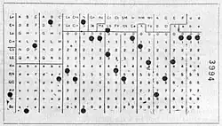 Die Karte wurde jedoch auf 45 Spalten mit je 12 Positionen erweitert.[23] Dies entsprach 45 Zeichen mit 12 möglichen Lochpositionen bei der für Lochkarten typischen Codierung. Eine binäre Codierung, welche die Löcher als Bits interpretiert, wurde anfangs nicht verwendet. Erst später wurde eine 6-Bit-Codierung benutzt, die es erlaubte, je Spalte 2 Zeichen (aus einem Zeichensatz von 64 Zeichen), auf der Karte insgesamt also 90 Zeichen zu speichern.