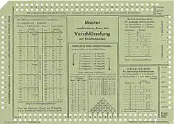 Für die Verschlüsselung der Codierung der Randlochkarten gab es «überlagerungsfähige» und «nicht überlagerungsfähige» Schlüssel. Beim Kauf eines Satzes «Schlitz-Randlochkarten» lag diese Musterkarte bei (s. Bild rechts). Interessant war die Kombination von Sichtlochkarten mit einer Randlochkarten-Verschlüsselung.