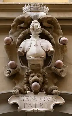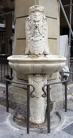 Die Büste von Cosimo II. mit dem Stephanskreuz, in der Inschrift als Egenorvm Patri („Vater der Bedürftigen“) bezeichnet, auf dem Mittelbogen über der Via de’ Neri ist ein Werk von Chiarissimo Fancelli (nach Filippo Baldinucci). Der Marmorbrunnen an der Ecke, der in der Literatur meist Fancelli zugeschrieben wird, ist bei Follini-Rastrelli als späteres, „fast modernes“ Werk verzeichnet. Trotz seiner spätmanieristischen Züge (siehe die Fontana dello Sprone, dem er nachempfunden ist) wurde er tatsächlich 1764 auf Initiative der lothringischen Regentschaft eingeweiht. Die Kunstfertigkeit des Bildhauers verleiht dem Werk eine lebhafte, spöttische Haltung des großen verzerrten Gesichts und der fließenden Linien, die auf das darunter liegende Wasserbecken zulaufen, eine barocke Form, die zwischen dem Imaginären und dem Realen angesiedelt ist. Das Werk wurde im Sommer 2014 im Rahmen des von der Stadt Florenz geförderten Projekts FLIC (Florence I Care) restauriert.