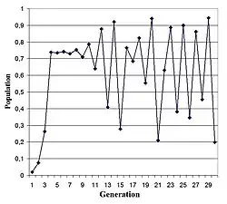 - Mit zwischen 2 und 3 nähert sich die Population dem Grenzwert alternierend, d. h. die Werte liegen ab einem bestimmten abwechselnd über und unter dem Grenzwert.